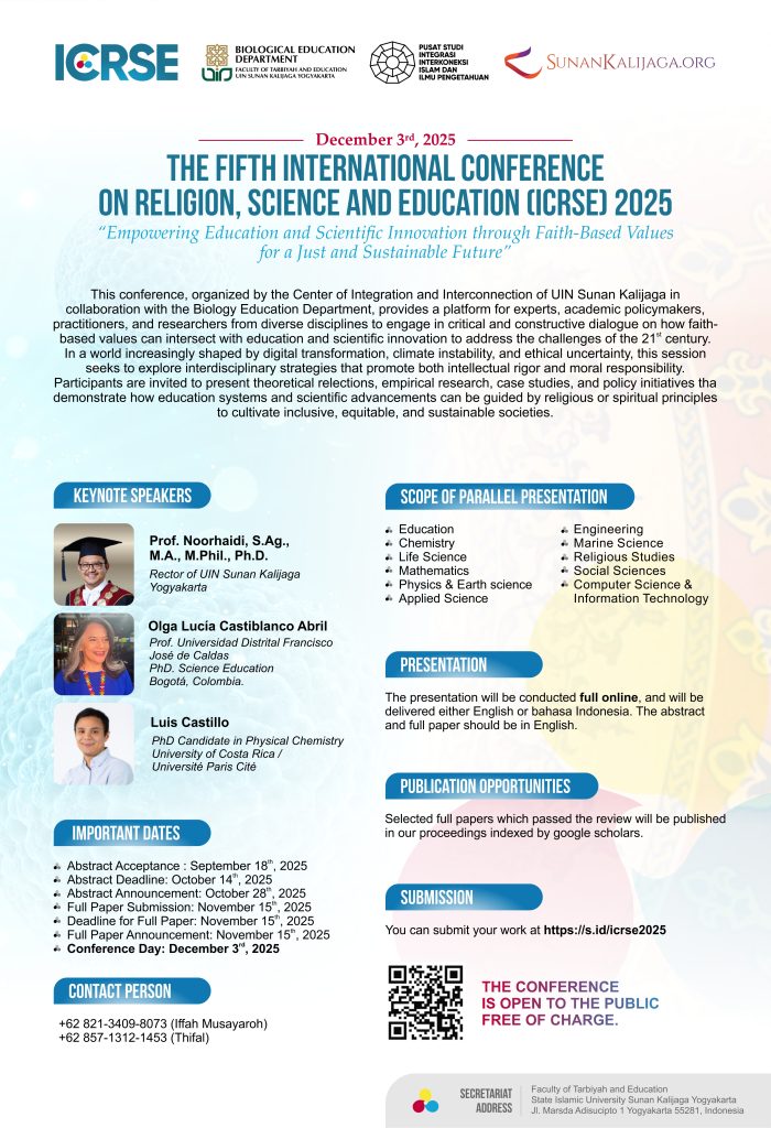 This conference, organized by the Center of Integration and Interconnection of UIN Sunan Kalijaga in collaboration with the Biology Education Department, provides a platform for experts, academic policymakers, practitioners, and researchers from diverse disciplines to engage in critical and constructive dialogue on how faith-based values can intersect with education and scientific innovation to address the challenges of the 21st century. In a world increasingly shaped by digital transformation, climate instability, and ethical uncertainty, this session seeks to explore interdisciplinary strategies that promote both intellectual rigor and moral responsibility. Participants are invited to present theoretical relections, empirical research, case studies, and policy initiatives that demonstrate how education systems and scientific advancements can be guided by religious or spiritual principles to cultivate inclusive, equitable, and sustainable societies.